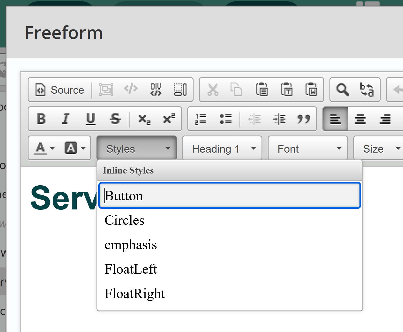 The styles available for text in a freeform block and the styles available for block classes are controlled in Admin. You can add them or remove them from the menu options.