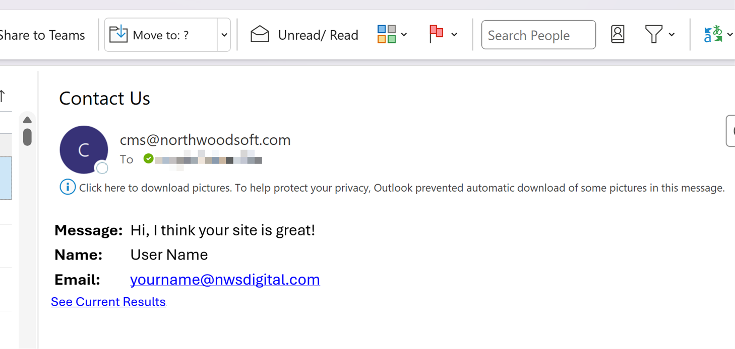 - When a user submits a form, you will get an email with the form name in the title, the chosen fields, and “See Current Results.”